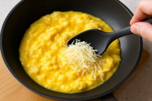- 🧀 Adiciona o queijo no ponto certo:Quando os ovos estiverem ainda húmidos, com líquido visível, junta o queijo ralado. Envolve delicadamente.📌 Aqui está o ponto crítico: retira do lume antes de estarem totalmente firmes — o calor residual termina a cozedura.