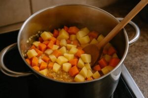 - Saltear os legumes de raiz: Adiciona a cenoura, a batata e o nabo ao tacho. Envolve no refogado e deixa saltear por 2–3 minutos, mexendo ocasionalmente.📌 selar ligeiramente os legumes no azeite quente intensifica o sabor.