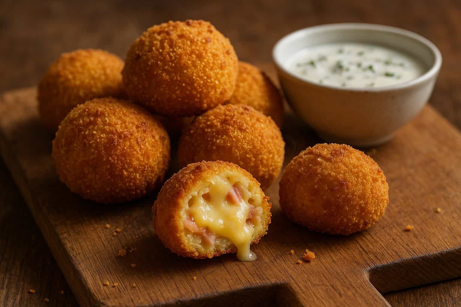 Panar: Bate o ovo para panar num prato fundo. Passa cada bolinha no ovo batido, escorre o excesso e envolve bem no pão ralado. Sacode o excesso. Para maior crocância sem novos ingredientes, passa rapidamente por ovo e por pão ralado uma segunda vez.